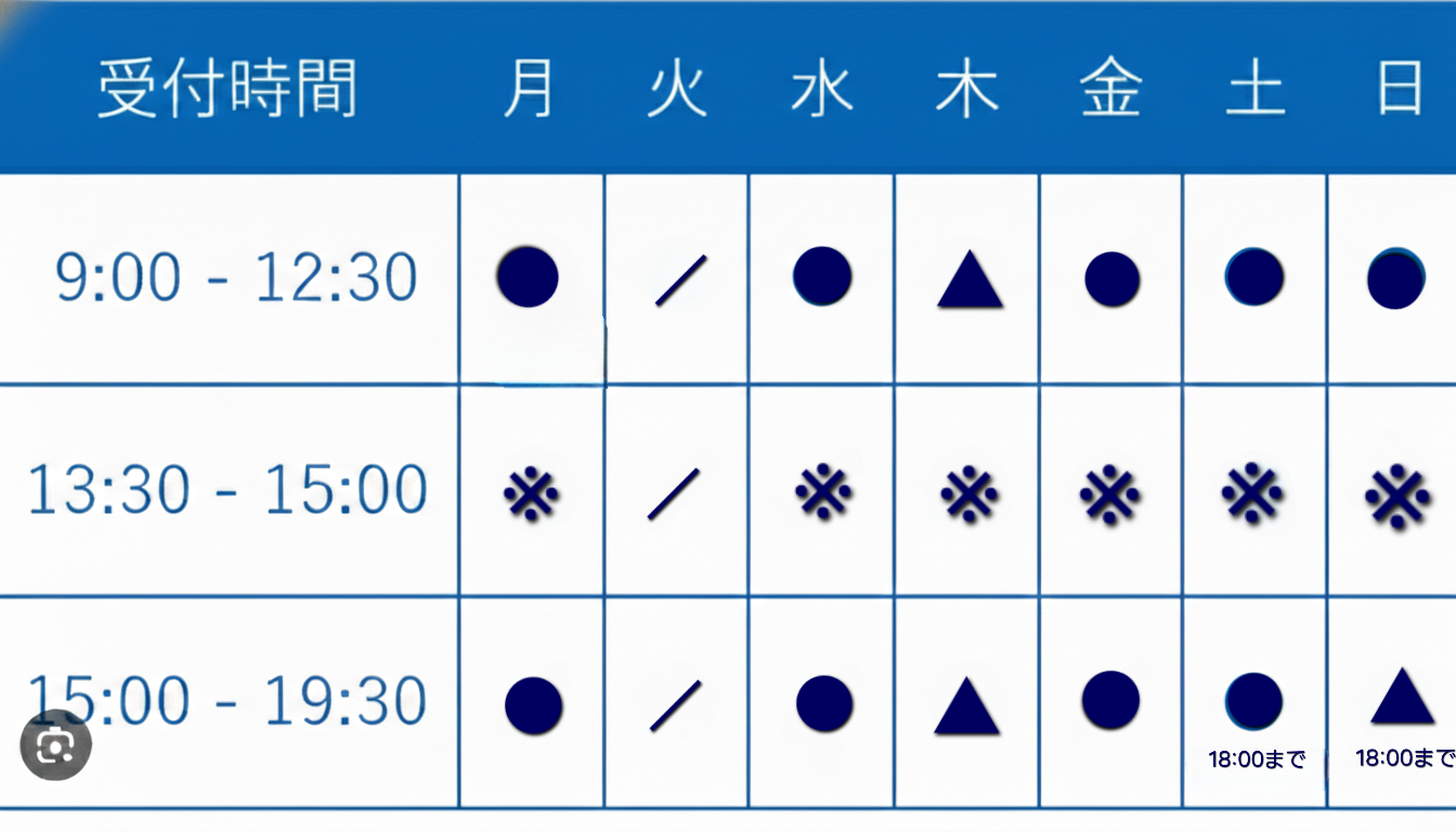 ・昼間の※は自費予約のみ。△の木曜日、日曜午後は通常受付しておりますが自費施術の予約優先制です。